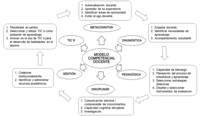 - Metacognitiva: el docente lleva a la reflexión su práctica educativa, detectando sus fortalezas sin caer en el egocentrismo, y sus debilidades, las cuales tendrá que trabajar éticamente y visualizarlas como posibles áreas de oportunidad. Las capacidades a desarrollar son: la autoevaluación docente, aprender de su experiencia, identificar áreas de oportunidad y evitar el ego docente.