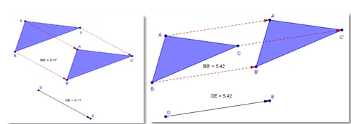 Descripción: Se activa la opción Polígono en la barra de herramientas y se dibuja un triángulo ABCcualquiera, se activa la opción Vector y se traza un vector con una magnitud considerada. Se activa la herramienta Trasladar; se da clic sobre el triángulo y sobre el vector en ese orden, y de esa manera se habrá trasladado el objeto según el vector de dirección dado. En la siguiente figura se muestran dos traslaciones del triángulo ABC y su nueva posición; el triángulo A'B'C'.