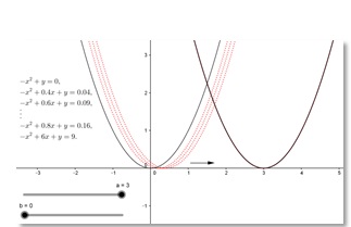 a. Si a=b=0, la ecuación es de la forma y-x^2=0 y su gráfica es la parábola con vértice en el origen. Al configurar la instrucción y al activar el deslizador a mediante la opción Animación se observa que la gráfica de la ecuación y-x^2=0 se traslada horizontalmente del punto origen del sistema coordenado al punto (3,0) y en ese proceso de traslación; la ecuación adquiere distintos comportamientos, algunos de ellos se muestran a continuación: -x^2+0.2x+y=0.01,-x^2+0.4x+y=0.04,-x^2+0.6x+y=0.09,-x^2+0.8x+y=0.16,…,-x^2+6x+y=9 ⇔(x-3)^2-y=0.