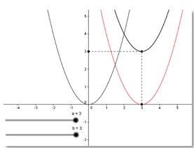 Instrucciones: Se inserta en la barra de entrada la expresión y-a=(x-b)^2; donde a y b son valores que recorren intervalos dados; en este caso ambos valores se definen en un intervalo cerrado que va de 0 a 3 y dichos valores se definen con la opción Deslizador en la barra de herramientas del software.