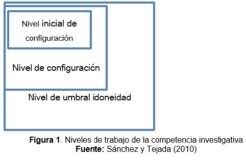 Estos autores, a su vez, mencionan tres niveles en los que se trabaja la competencia investigativa: 1) nivel inicial de configuración, 2) nivel de configuración y 3) nivel de umbral de idoneidad, en donde se genera la triangulación entre el ámbito laboral, el académico y el investigativo. De esta manera, es evidente que la competencia no se conceptualiza en un solo estadio, sino que se va desarrollando y perfeccionando poco a poco, a partir del empleo de la misma en diferentes situaciones y contextos, lo cual se expresa en el siguiente gráfico: