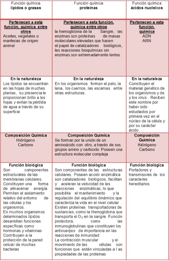 En la siguiente tabla se ejemplifica la relación función química – función biológica de las principales biomoléculas a estudiar en el programa de Biología y su correspondiente relación con la naturaleza.