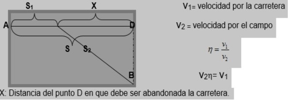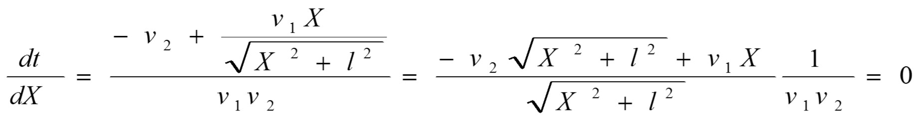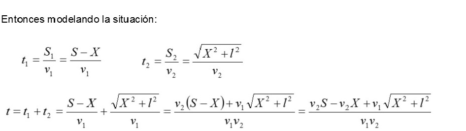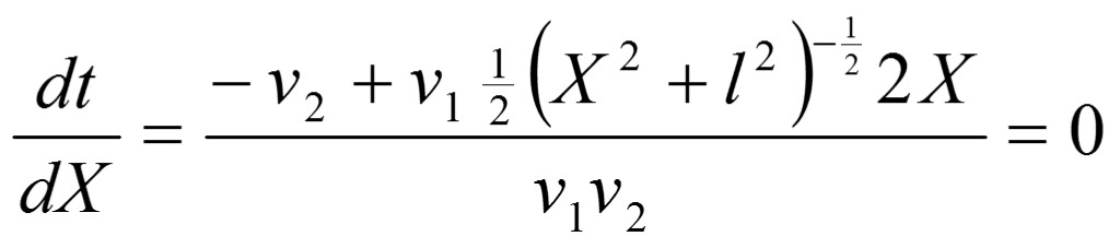 Como S no depende de X, aplicando la condición de mínimo, es decir, determinando la primera derivada de t respecto a X e igualándola a cero, se puede determinar la X que corresponda al tiempo mínimo.