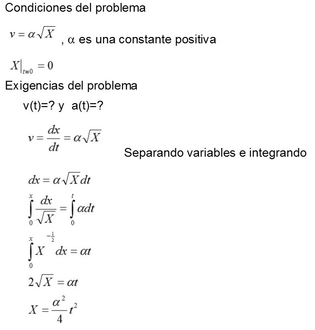 En este problema se aplican los conocimientos relacionados con la integral definida al problema inverso de la cinemática. Una partícula se mueve en la dirección positiva del eje X de modo que su velocidad varía según la ley V= (alfa)por X, donde,( alfa) es una constante positiva. Teniendo en cuenta que en el momento t = 0 se encontraba en el punto X = 0, determinar: