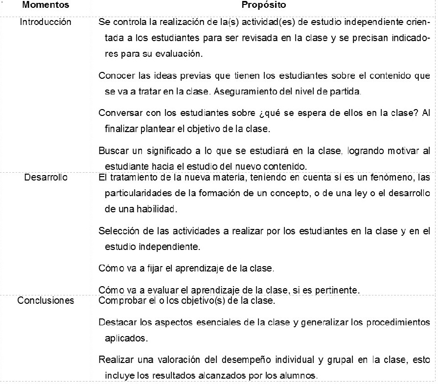 Al valorar la estructura metodológica de la clase hay quien considera que “debe contar de cuatro partes fundamentales: introducción, desarrollo, recapitulación y evaluación” (Salcedo, 2002, pág. 22), otros plantean que la secuencia de actividades para la enseñanza obedece a “un inicio, un durante y un final, en otras palabras la secuencia de actividades se plasma de acuerdo a, la introducción, el desarrollo y las conclusiones” (Gutiérrez, 2012, pág. 42), también se considera que, “toda clase posee en su estructura una secuencia lógica expresada en sus tres momentos principales: introducción, desarrollo y conclusiones” (Álvarez, Almeida, & Villegas, 2014, pág. 145), nos identificamos con lo planteado por estos dos últimos autores, ya que durante la planeación de las clases de Física, Matemática, Biología, Química y Geografía el profesor debe tener presente qué actividades van a realizar el docente y los estudiantes durante la introducción, el desarrollo y las conclusiones de esta. Por otra parte debe procurar que esas actividades obedezcan a la habilidad declarada en el objetivo o los objetivos de la clase y a los métodos propuestos.