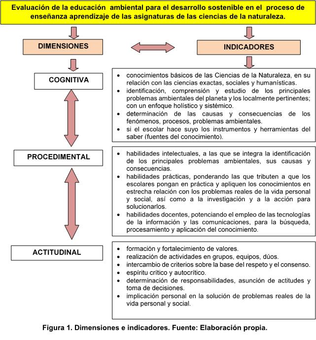 Como otro hallazgo del proceso investigativo, se presentan las dimensiones e indicadores (Figura 1.), muy útiles en el diseño de ejercicios para la evaluación de la incorporación de la educación ambiental para el desarrollo sostenible al proceso de enseñanza aprendizaje de las asignaturas de las Ciencias de la Naturaleza.