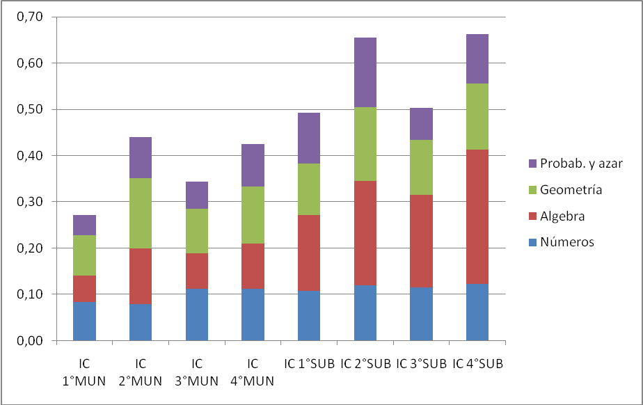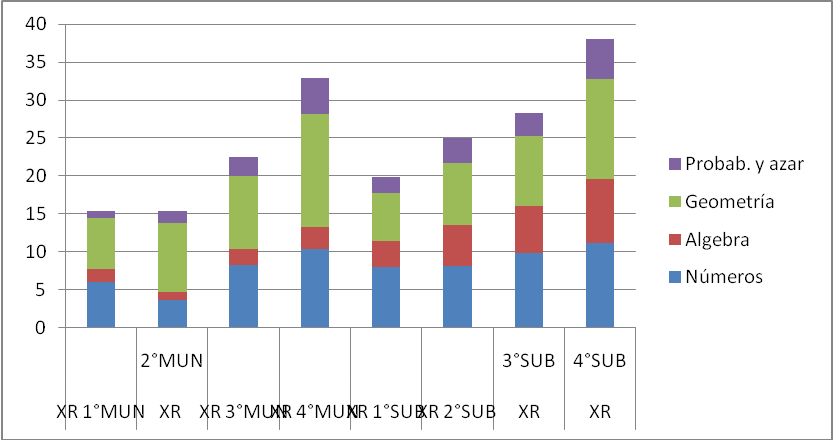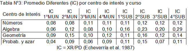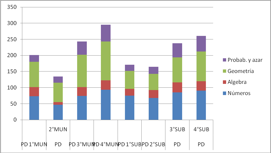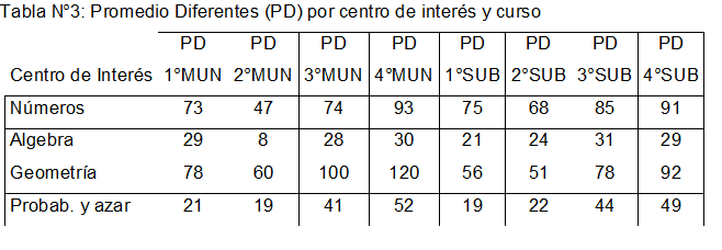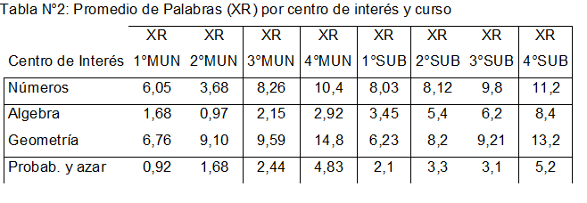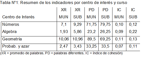En las siguientes tablas 1-2-3 y en los respectivos gráficos presentamos primero un resumen de todos los centros (NUM= números, ALG= álgebra, GEO= geometría, PROB= probabilidades y azar)por tipo de establecimiento (MUN = municipal y SUB = subencionado), para continuar en forma detallada con el promedio de palabras y las palabras diferentes por cada centro. Finalizamos el análisis con el índice de cohesión, el cual permitió visualizar de mejor forma los resultados.